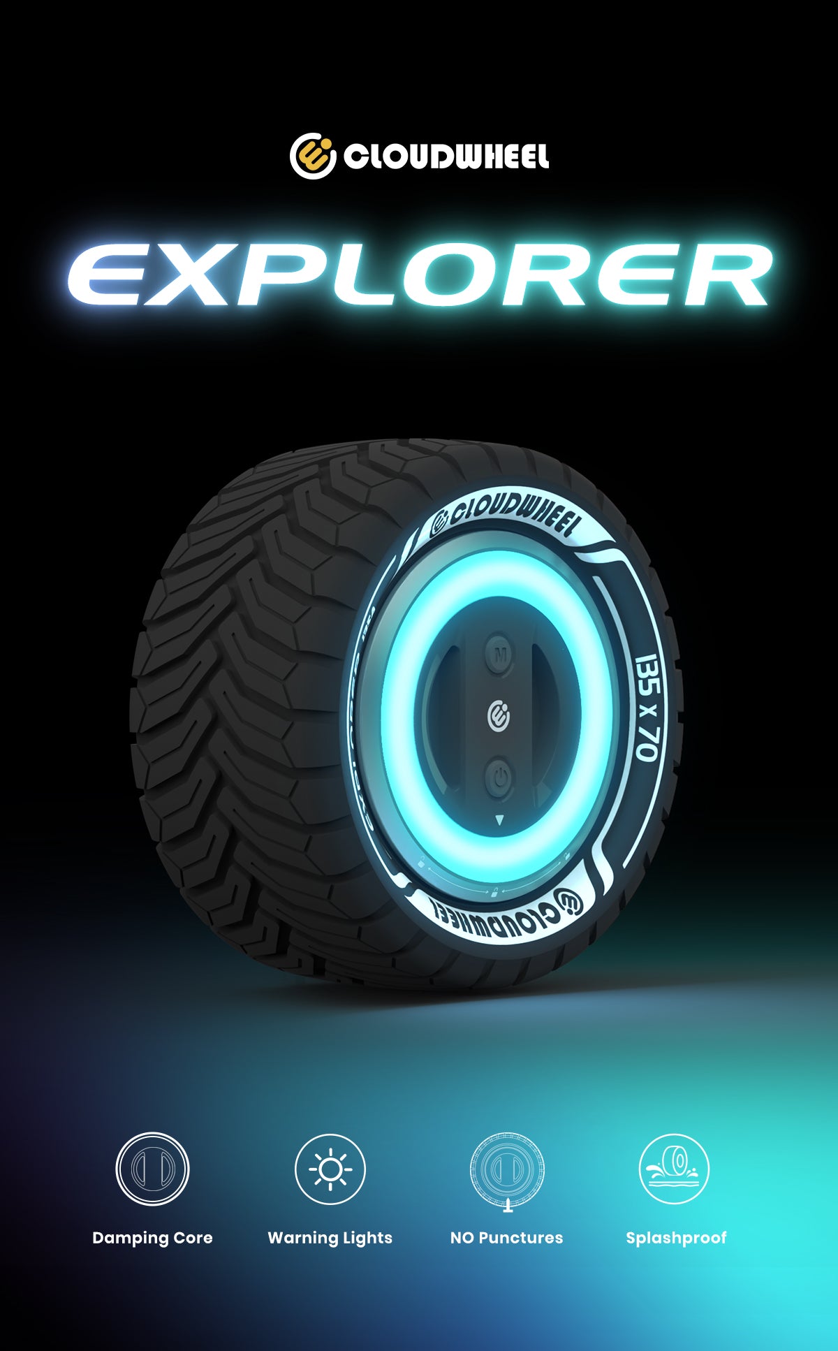 The Explorer wheels are equipped with CloudNeon safety warning lights, which not only enhance safety but also offer multiple lighting modes, including full-color RGB, with synchronized illumination across all four wheels.