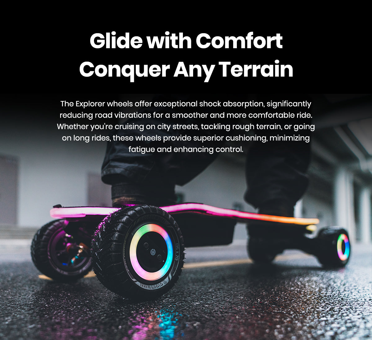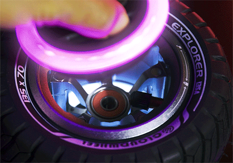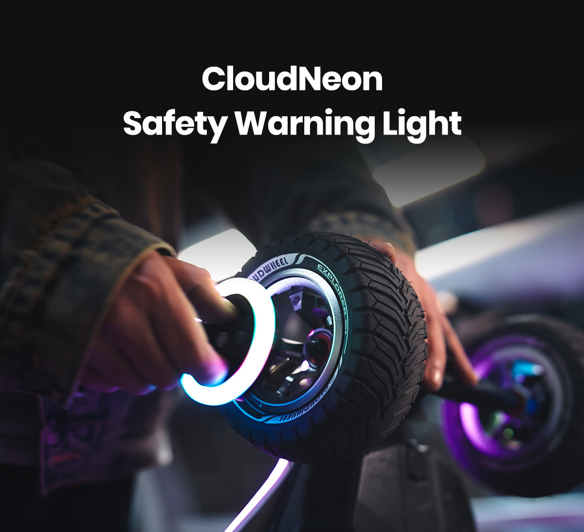 The Explorer wheels feature CloudNeon safety warning lights, offering multiple lighting modes and synchronized illumination across all four wheels. CloudNeon enhances visibility, alerting nearby vehicles and pedestrians to reduce collision risks and improve riding safety.