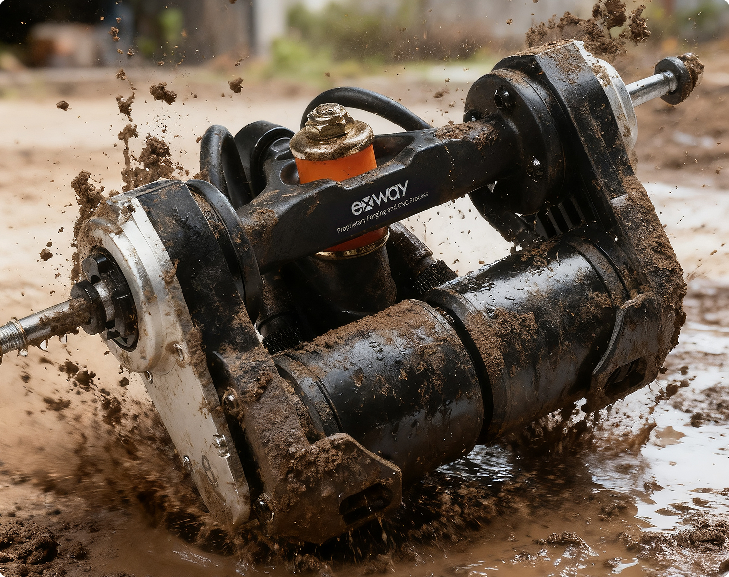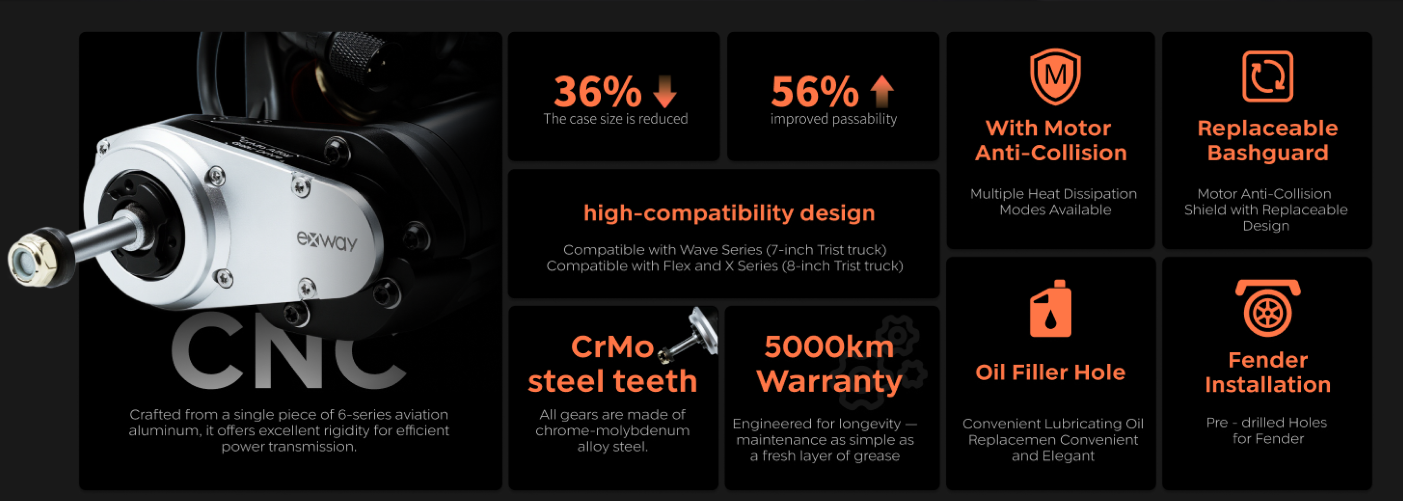 The first gear drive system with a size of less than 50mm, made of high-strength chrome-molybdenum alloy material—Exway's innovation never stops!The ground clearance is increased, boosting passability by 56%; the minimum size of wheels that can be used is reduced from 100mm to 70mm.