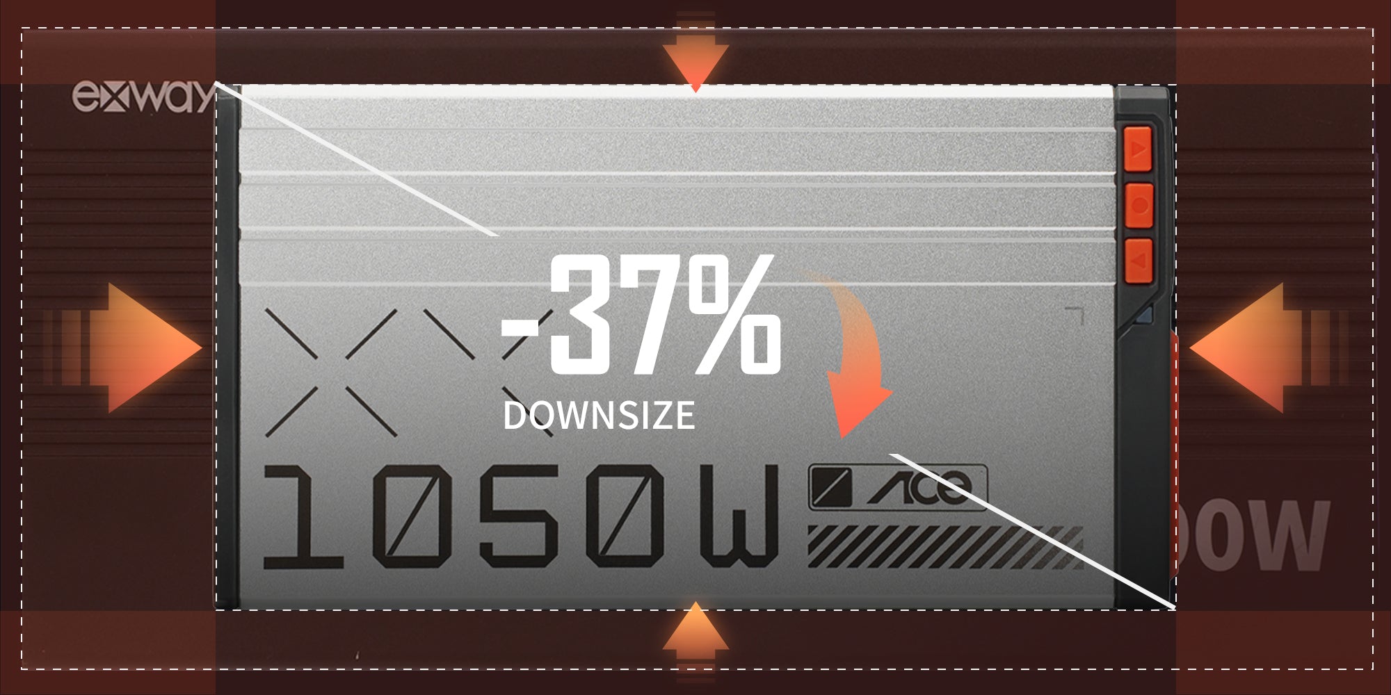 The SC1050 Smart Super Charger, with a slight increase in power, has reduced its size by 37% (164×90×53mm) and increased its power density by 37% to an unprecedented 1.39W/cm² for Exway. This power density is far ahead of currently commercialized products!