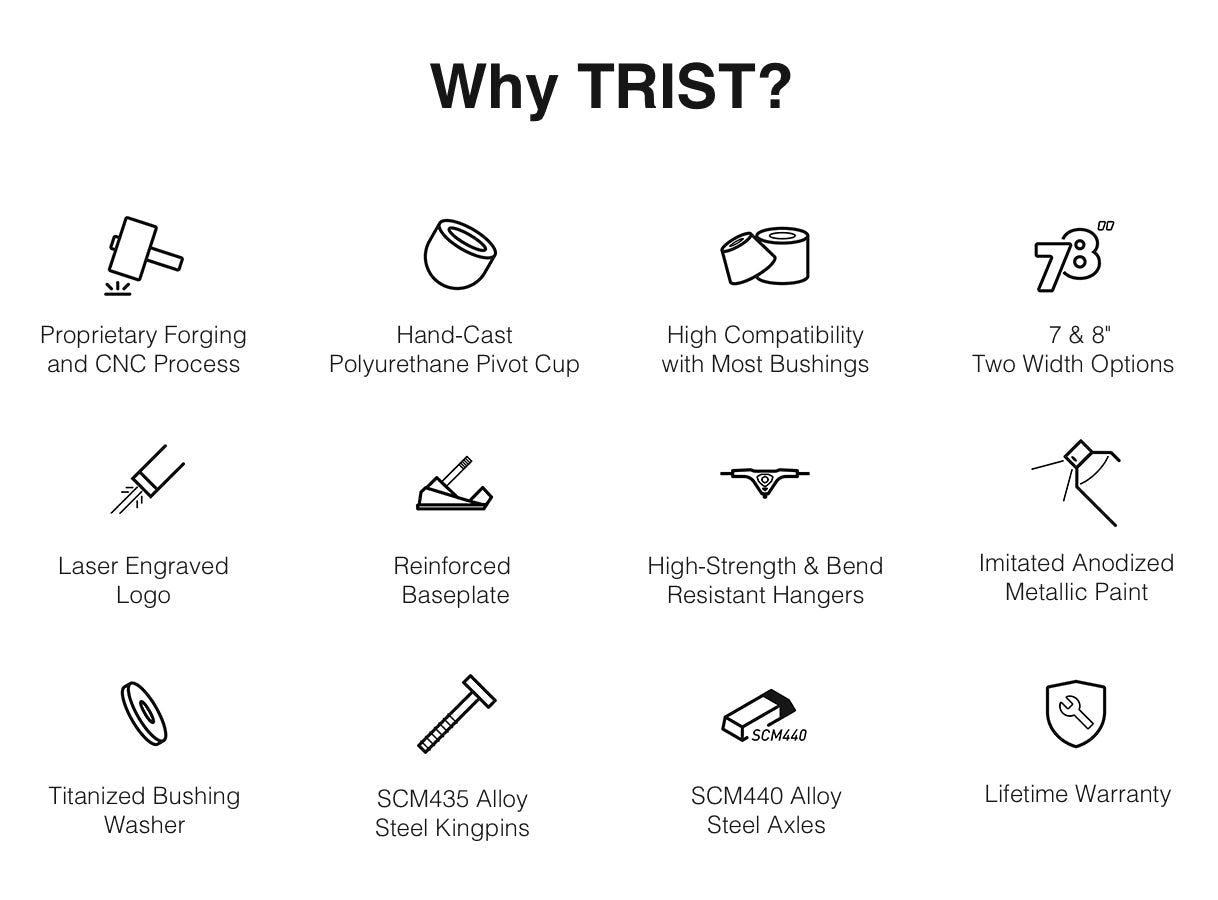Both the top and bottom bushings are equipped with cup washers to keep the bushings in place during carving and improve their responsiveness. Fine-tuned by professional skaters with countless tests and revisions, Trist has reached the best balance between stability and flexibility and provides you with a default setup suitable for different boards.