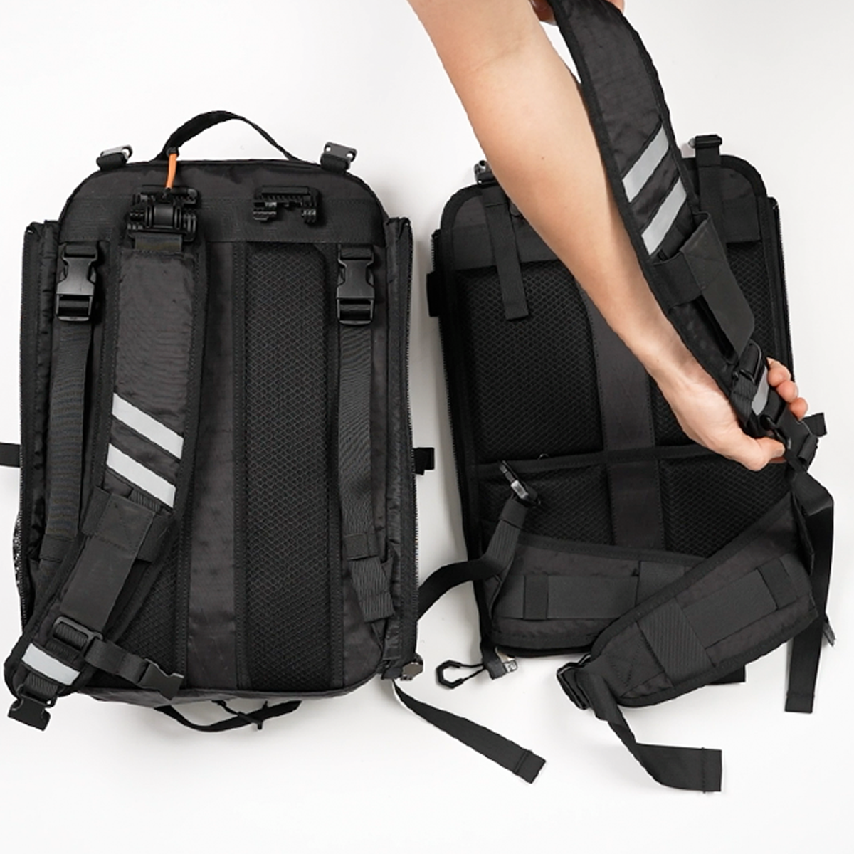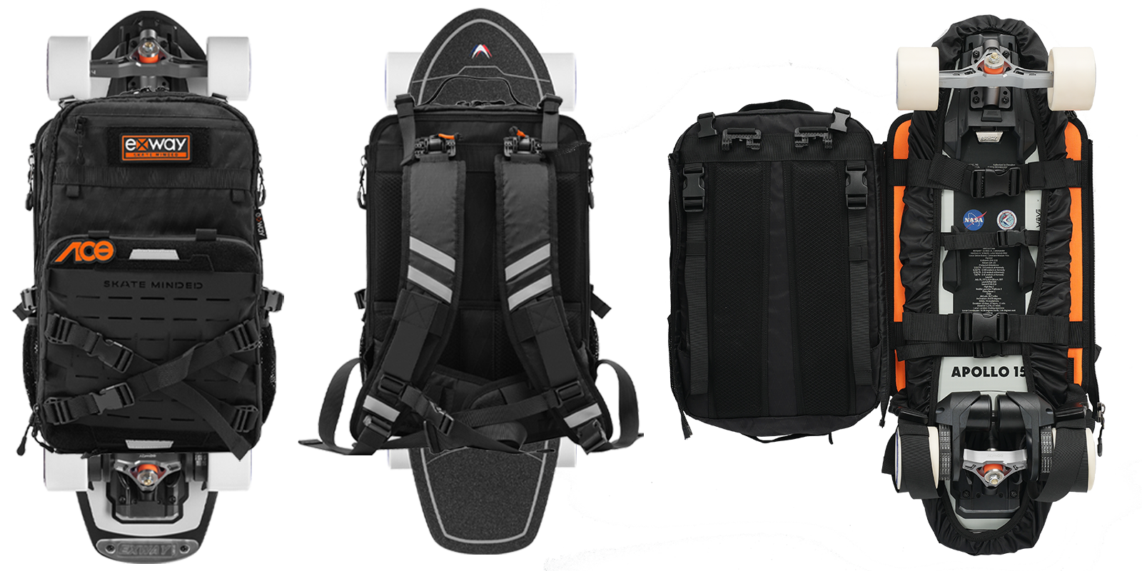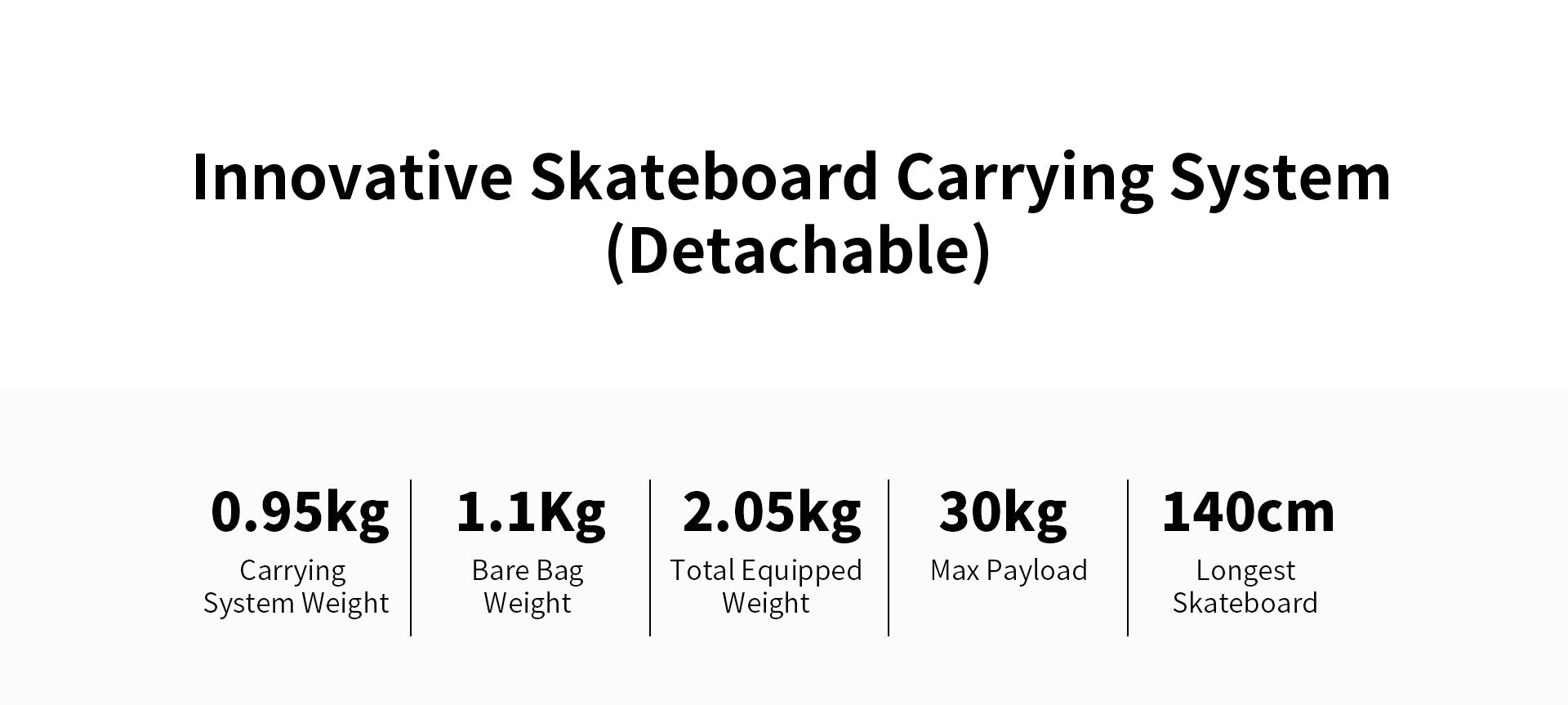 Detachable skateboard carrying system, 56% lighter compared to Exway's previous generation backpack (2.5kg reduced to 1.10~2.05kg)