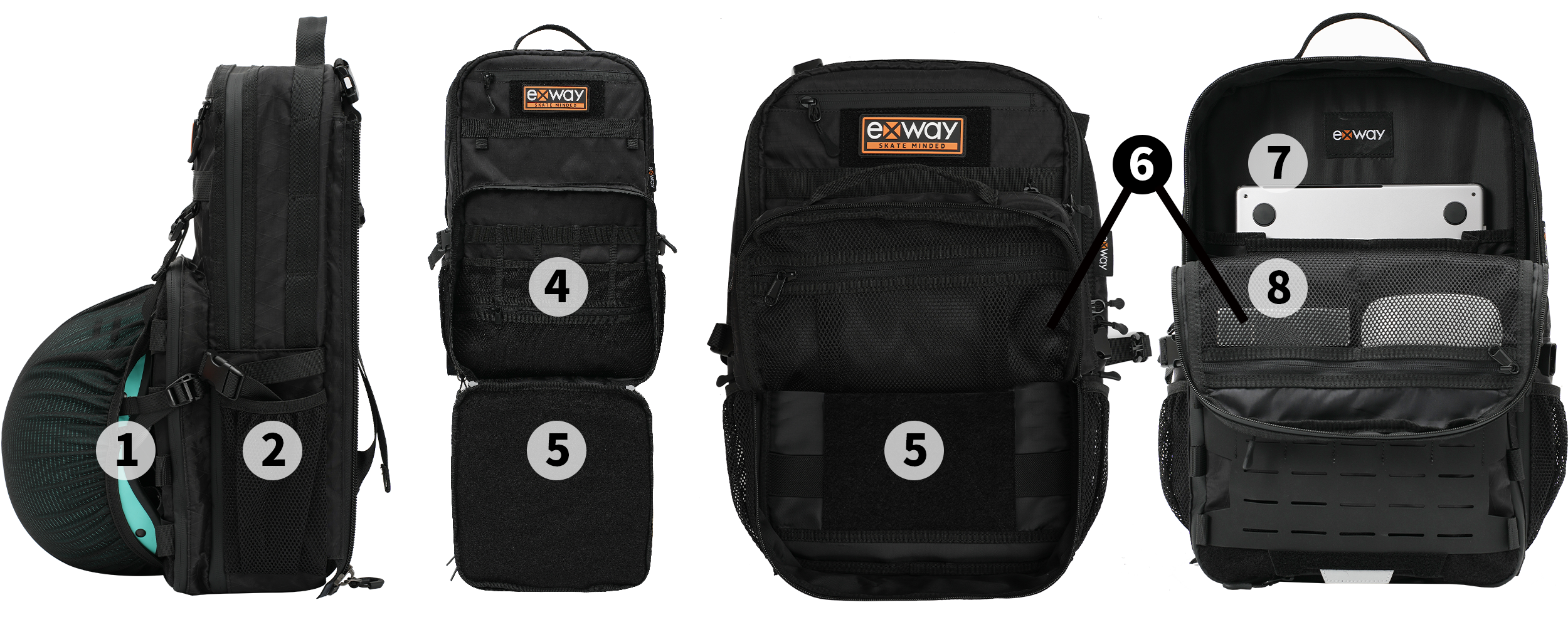 1: Helmet net (hidden),2: Dual side water bottle nets,3:Document Storage,4:Storage compartments, well-organized,5:Velcro Storage Space,6:Main compartment dual openings for easy access,7:Tablet + Laptop 2-in-1,8:Zipper mesh pocket