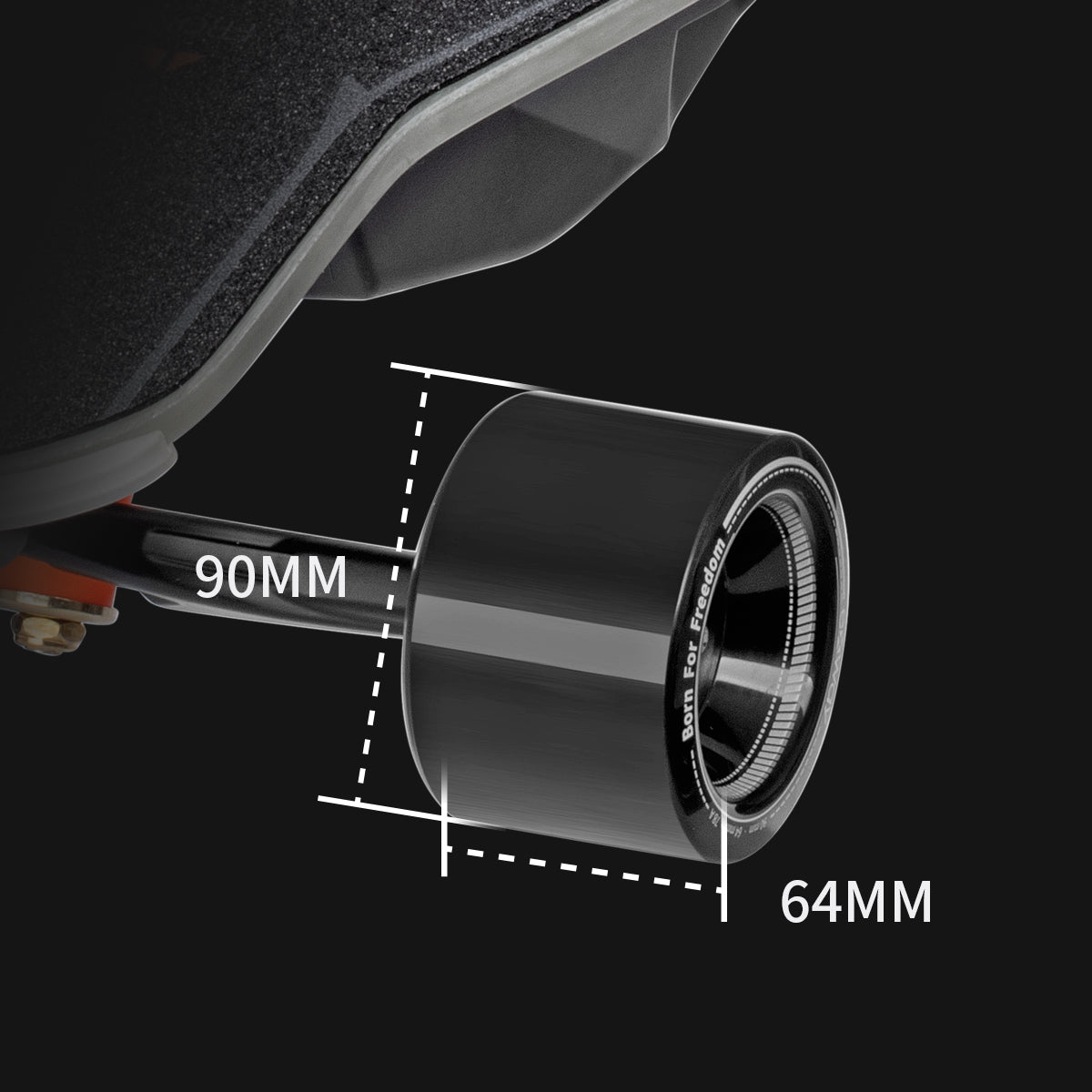 WHEELS: 90*64mm 80A high resilience polyurethane.Compatible (any skateboard wheels from 80-120mm)